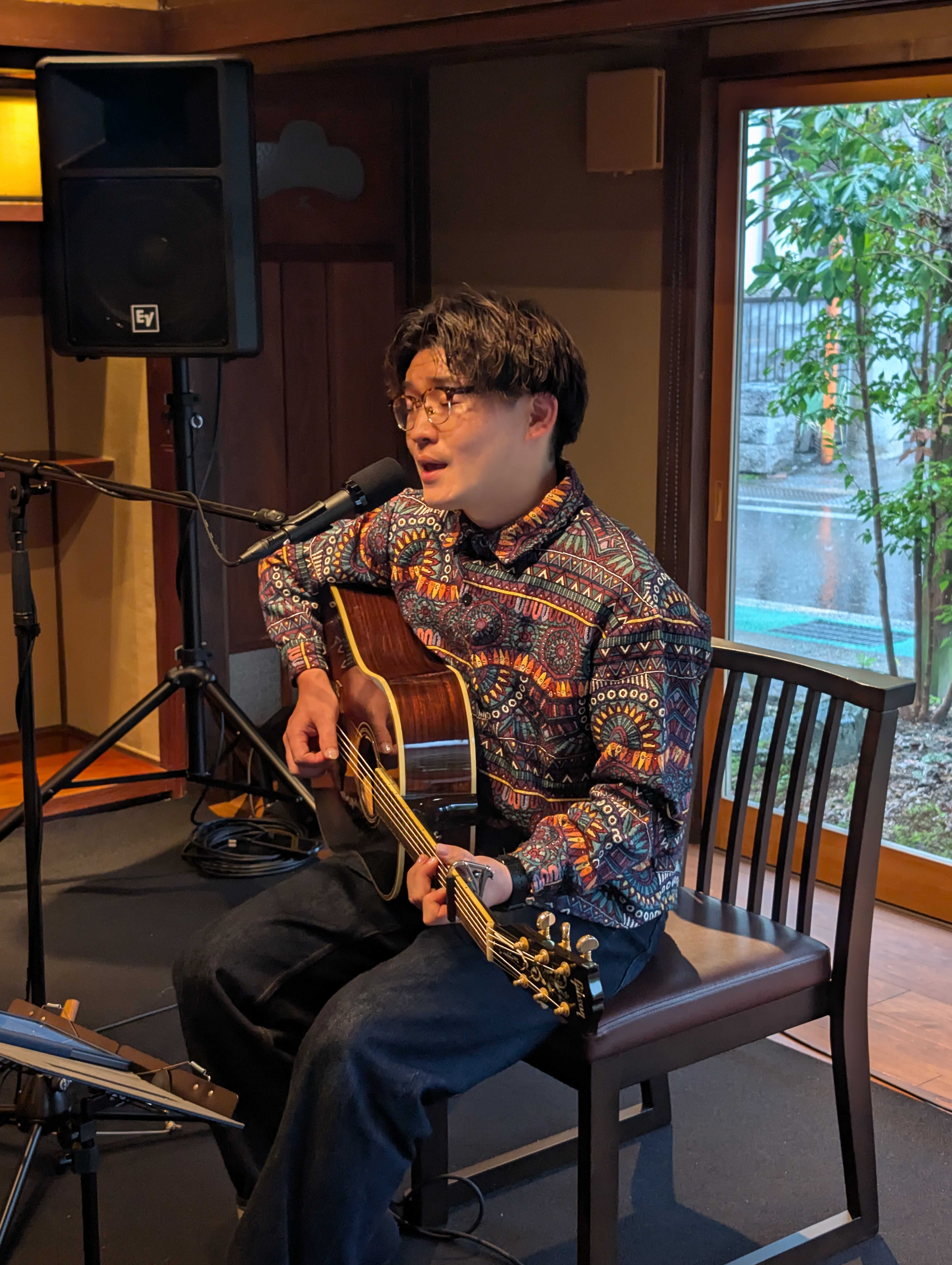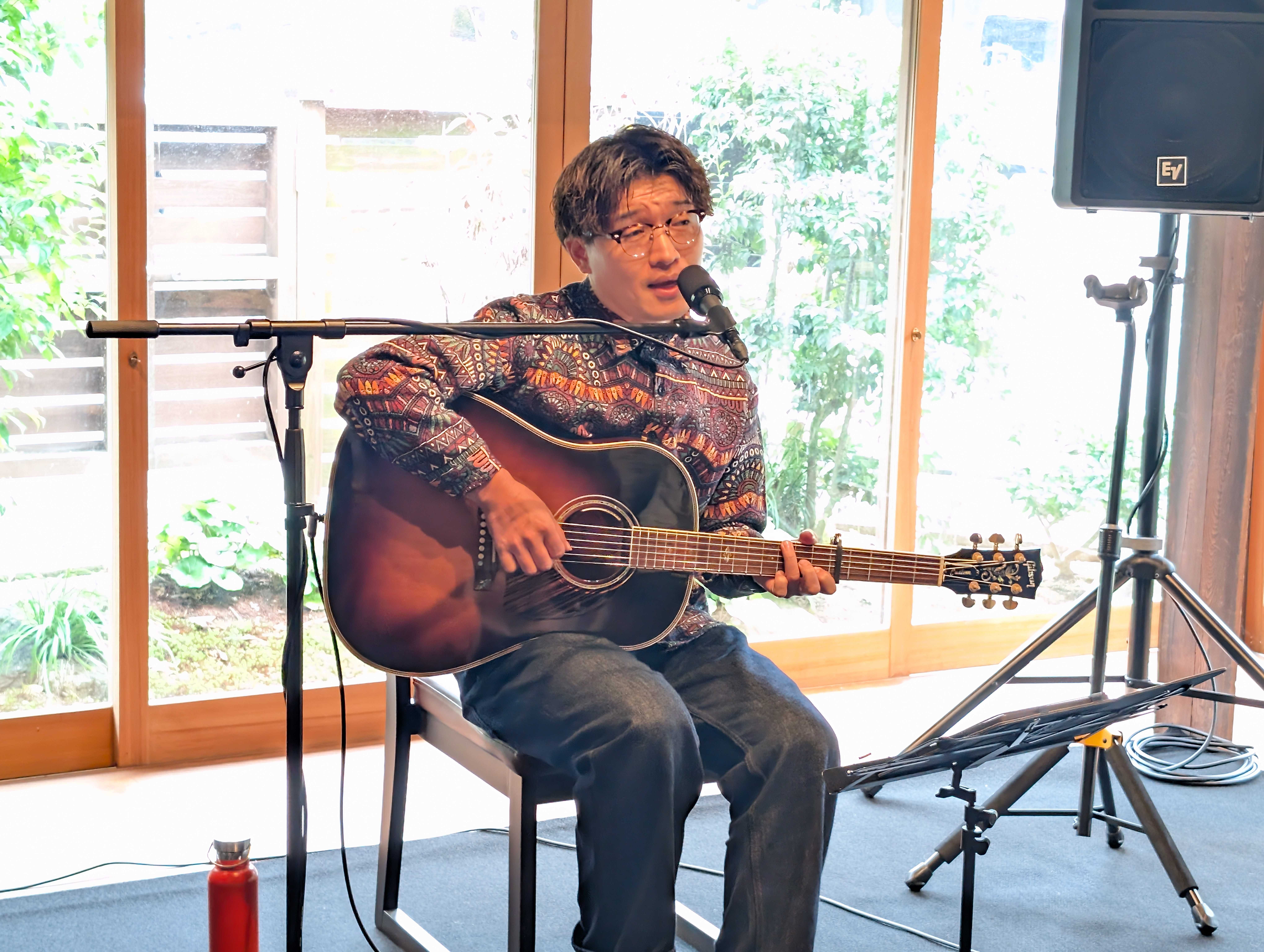 】昨年3月2日(土)に「diningcafeいと」で開催し、大変ご好評をいただきました木下徹さんの初ライブ。皆様からの「あの感動をもう一度」という熱いご要望にお応えし、この度10月26日(日)にワンマンライブを開催いたしました。今回は会場を母屋棟に移し、より多くの方にお楽しみいただけるよう2部制での開催となりました。お陰様で、2部(各回20名様)ともにチケットはSOLD OUTとなり、大盛況となりました!オリジナル曲・カバー曲を含めた木下徹ワールドが全開で、前回同様「あっ!」という間の1時間半でした♬曲の間奏で披露された素敵な口笛や、演奏の素晴らしさはもちろんのこと、ユーモア溢れるトークも会場を盛り上げ、客席と一体となった熱気あふれるライブとなりました。「是非ともまた聴きたい」「癒されました」など、ご来場くださったたくさんの皆様から熱いお声を頂戴いたしました。幅広い世代に愛される名曲をはじめ、心に響くオリジナルソングの数々を歌っていただき、感動のライブとなりました♫♪♫それではライブの様子をご覧ください