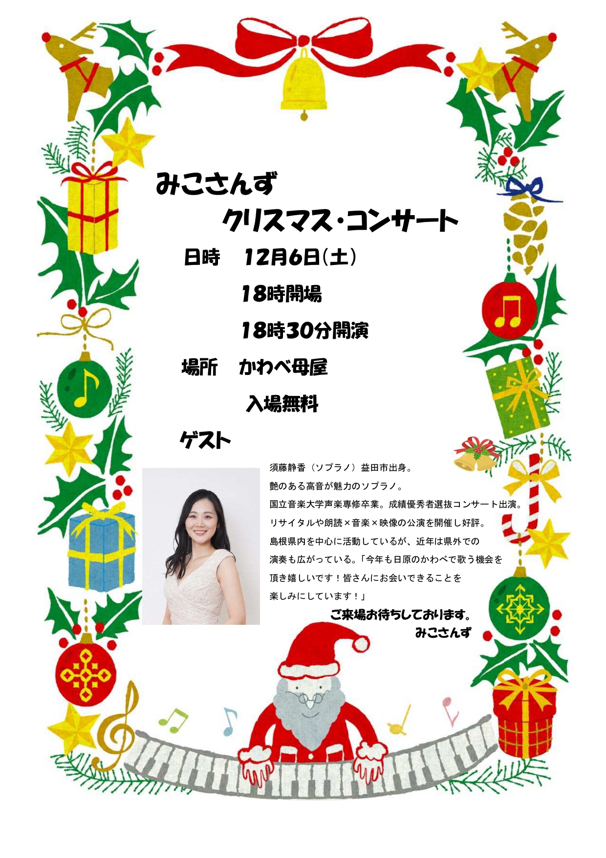 須藤静香さんをゲストにお迎えして🎅🏻クリスマスコンサート🎄🎹🎸🎷🥁を開催されます🎶